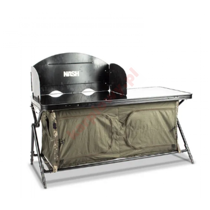Praktyczny mebel kempingowy Bank Life wyposażony w składaną osłonkę przeciwwiatrową, która ułatwia gotowanie, a dodatkowo zapobiega zgubieniu akcesoriów wędkarskich, kiedy warunki wymagają otwarcia drzwi i przewiewu w Gazebo.