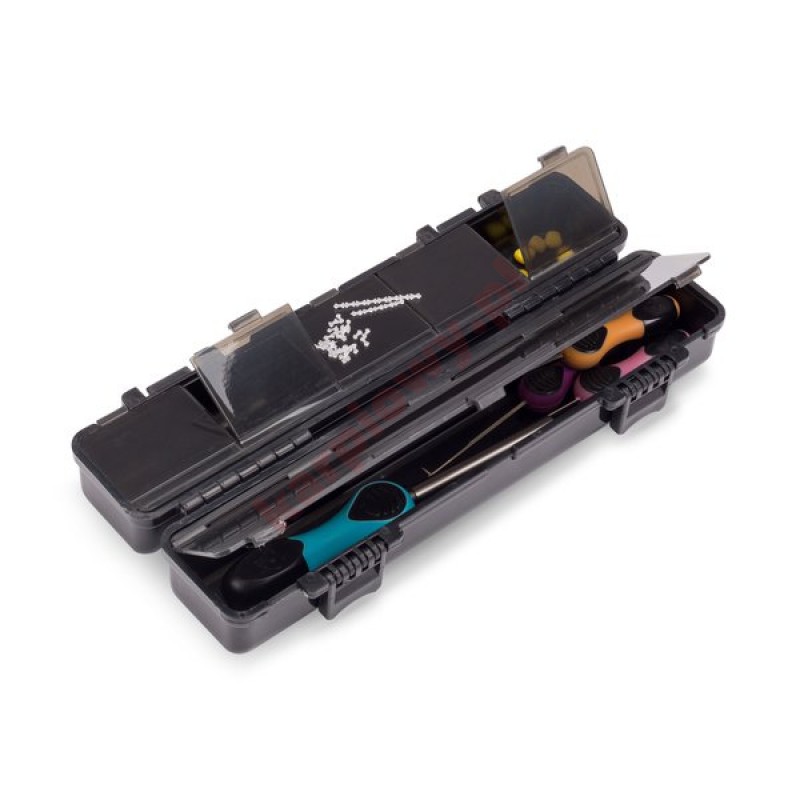Sprytne, dwustronne pudełko, które posiada długą przegrodę na igły i narzędzia oraz pięć małych przegródek na stopery, masę dociążającą, szybkozłączki i inne drobne akcesoria. Przybornik mieści się w pudełkach Medium oraz Large Box Logic Tackle Box.