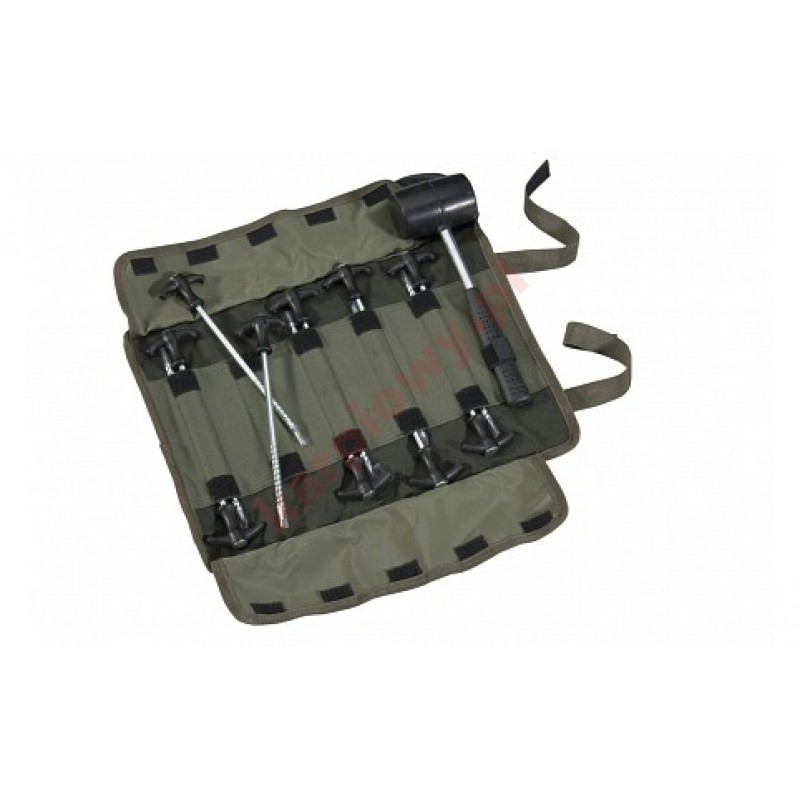 Wysokiej jakości zestaw śledzi do namiotu i gumowy młotek. Kołki są wyjątkowo mocne i zabezpieczone antykorozyjnie. Są przeznaczone do wbijania w twardy grunt. W komplecie z luksusową torbą.