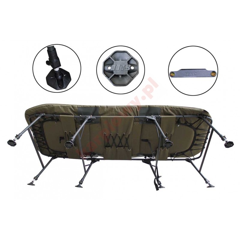 - osiem niezależnie regulowanych nóg z szerokimi stopami, pozwalające ustawić łóżko stabilnie nawet na nierównym gruncie;
