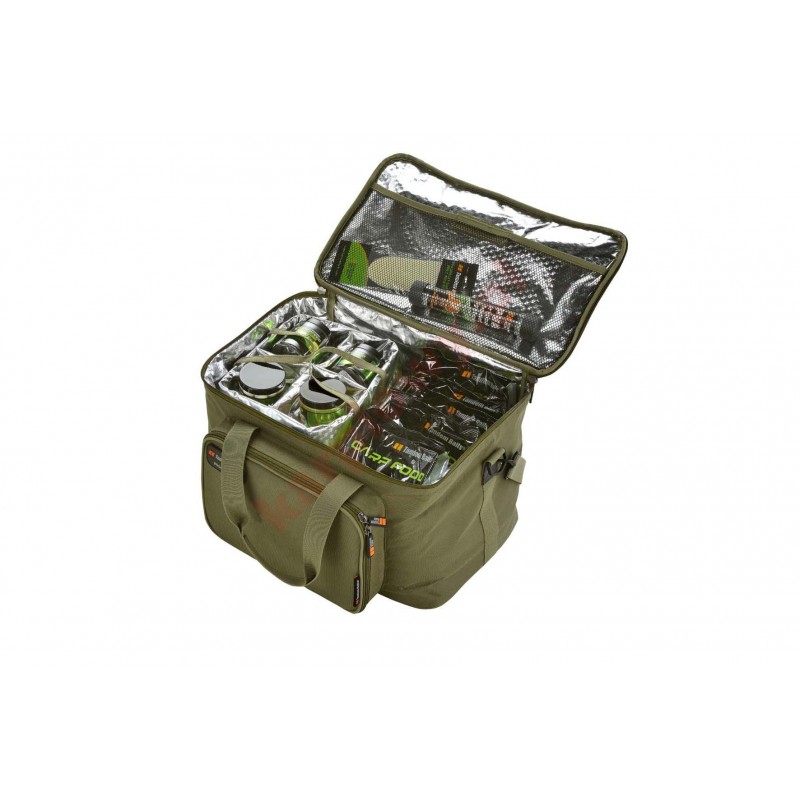 Duża torba do przechowywania przynęt, atraktorów i dipów. Wyłożona jest specjalnym materiałem termoizolacyjnym utrzymującym przynęty w dobrej kondycji izolującym je od warunków zewnętrznych. Wewnątrz torby znajdują się dwa koszyki z przegródkami na dipy, boostery i pudełka z przynętami haczykowymi. Można dowolnie konfigurować układ wewnątrz torby w zależności od potrzeb i ilości oraz rodzaju przewożonych przynęt.Dolna część wzmocniona mocną tkaniną PVC „Ball Leather” i dodatkowo twardymi gumowymi jeżami. Torba posiada dodatkową przednią kieszeń na niezbedne akcesoria, materiały PVA itp. Zastosowany materiał, mocne zamki, oraz dodatkowe pasy wzmacniające, zapewniają jej wyjątkową wytrzymałość i niezawodość. Szeroki antypoślizgowy pasek naramienny i miękki wyściełany uchwyt dają komfort podczas transportu. Górna klapa oraz kieszenie otwierane przy pomocy dwukierunkowych zamków zapewniają łatwy i szybki dostęp do wnętrza oraz ułatwiają pakowanie torby.