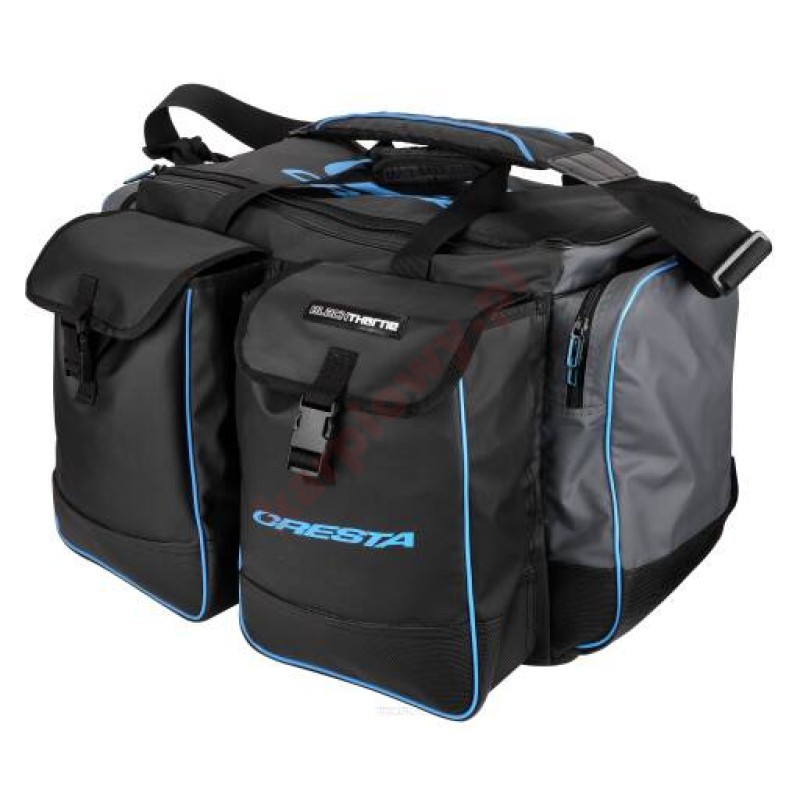 Luksusowa torba do przechowywania i transportu wszelkiego rodzaju akcesoriów. Wyposażona w solidny, regulowany pasek na ramię oraz podwójne uchwyty. Tył torby jest wykonany z bardzo grubej wyściełanej podszewki, dzięki czemu jest komfortowa podczas przenoszenia. Prostokątna komora główna pomieści wiele dużych akcesoriów i można ją otworzyć na całej powierzchni dzięki dwóm zamkom błyskawicznym zapinanym na rzep. Obie boczne kieszenie są w pełni zamykane dzięki podwójnemu zamkowi i mogą pomieścić mniejsze akcesoria. Obie przednie kieszenie oferują miejsce na 3 torby na akcesoria EVA w rozmiarze S od firmy Cresta, lub na dodatkowe akcesoria feederowe czy też spławikowe.