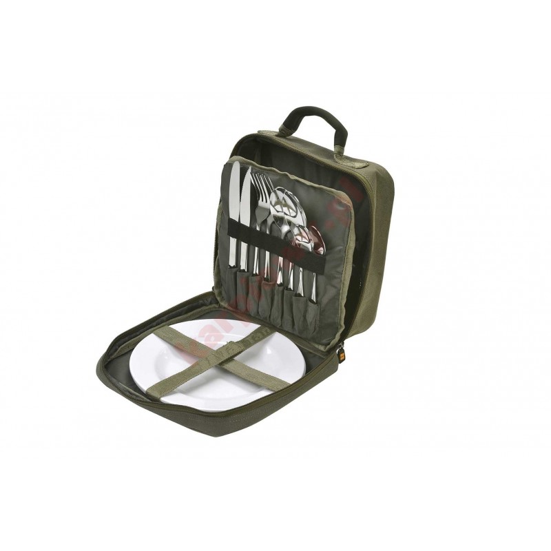 Zestaw obiadowy przydatny na łowisku wyposażony w komplet sztućców (nóż x2, widelec x2, łyżka x2, łyżeczka x2), 2 talerze, 2 kubki ze stali nierdzewnej, 2 pojemniki na przyprawy, i ręcznik z logo TB.