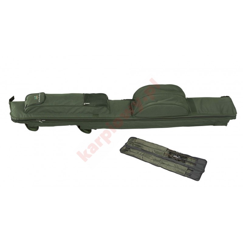 Pokrowiec na 2 wędki z zestawem + 2 niezmontowane, z wytrzymałą wyściółką i bocznymi przegrodami na podbierak, parasol albo inny sprzęt. Wędki chronione są przez dodatkowe, pojedyncze, wyściełane zamknięcia. • Material: poliester 600 D z wodoodporną powłoką PVC