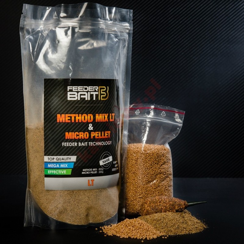 To absolutna nowość na rynku, która daje możliwość zakupu jednego produktu zamiast dwóch. Opakowanie zawiera 800g mixu oraz 200g micro pelletu, co daje kilogramowe opakowanie. Method Mix LT jest wyprodukowany na bazie wielu półproduktów pochodzenia roślinnego, natomiast całość dopełnia mączka LT94. Postanowiliśmy stworzyć mix oparty na mączce LT94 gdyż jest ona od wielu lat ceniona, zwłaszcza wśród karpiarzy, jako dodatek do kulek proteinowych oraz stick mixów. LT94 swoją skuteczność zawdzięcza procesowi jej pozyskiwania, otóż tłoczenie odbywa się w niskich temperaturach. Taki proces technologiczny sprawia, że mączka LT94 zachowuje o wiele więcej składników odżywczych o wysokim aminogramie a poziom strawnego białka sięga 94%. Należy jednak pamiętać, iż wysoka skuteczność Method Mixu LT & Micro Pellet nie wynika tylko i wyłącznie z zastosowania tego półproduktu. Cały sekret tkwi w dobraniu pozostałych składników tak, aby nie „gryzły” się one z ową mączką LT94. Cały mix został zaprojektowany zgodnie z Technologią Feeder Bita, co jest kolejnym czynnikiem podnoszącym skuteczność mixu. Opakowania dopełnia osobno zapakowany 200g Micro Pellet. Uczyniliśmy tak za sprawą owej Technologii S&QR, która traci swoje właściwości w momencie domoczenia micro pelletu zmieszanego z metod mixem. Mix i Pellet powinien zostać domoczony oddzielnie tak, aby osiągnąć odpowiednią konsystencję obydwu produktów a dopiero kolejnym krokiem jest zmieszanie obydwu ze sobą. Method Mix połączony z Micro Pelletem przed namoczeniem doprowadzi do sytuacji, w której Pelle będzie niewłaściwie przygotowany, ponieważ mix o drobnej frakcji pochłonie wodę zanim Pellet otworzy swoją strukturę i właściwie namoknie. Tak, więc powstał produkt, którego odpowiednie przygotowanie nie zaburzy jego pracy a tym samym wpłynie na znacznie większą liczbę poławianych ryb.