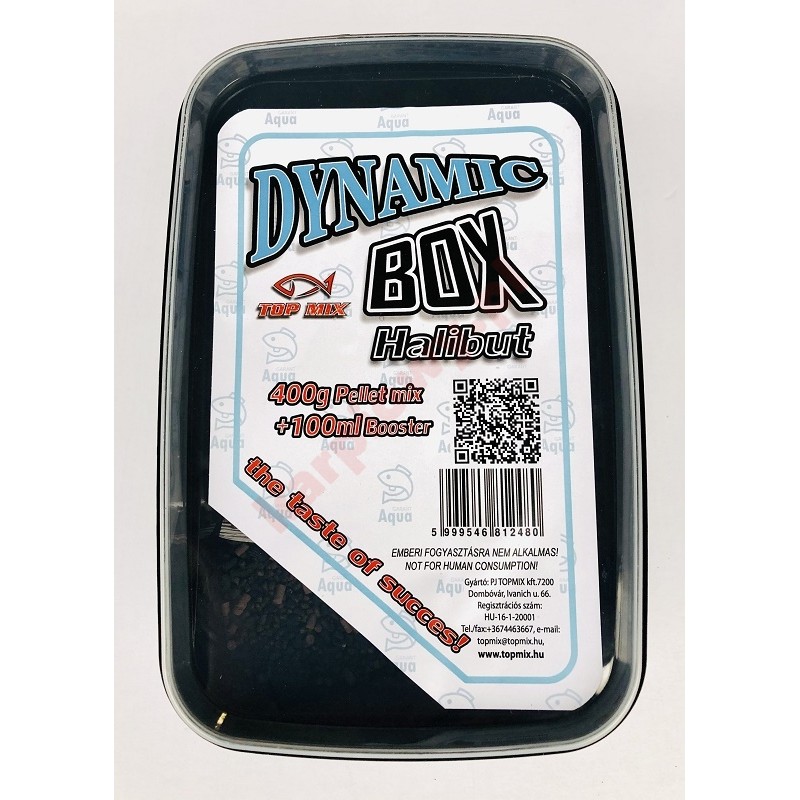 Top Mix DYNAMIC Pellet Box Halibut - gotowy zestaw do metody Dynamic Box - gotowy zestaw pelletów + saszetka do namaczania 100 ml Rozmiar: 2mm Aromat : Halibut Kolor: brązowy + czarne cząstki Waga: 400 g pellet + 100 ml aromat