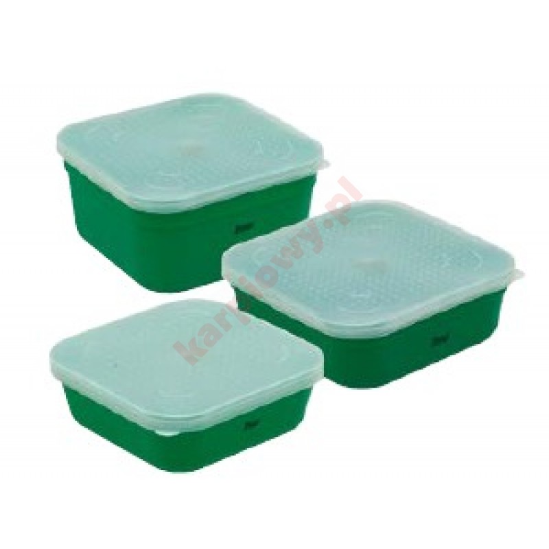 Zielone pudełka z mikro do przetrzymywania przynęt gotowych do kontroli przed zawodami. 0.6, 1.2 i 1.8L