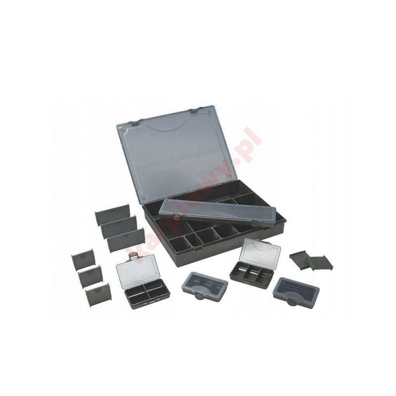 Praktyczny zestaw pudełek karpiowych, który składa się z dużego pudełka z wyjmowanymi przegródkami, cztery małe mini pudełka i jedno pojedyncze na przypony.