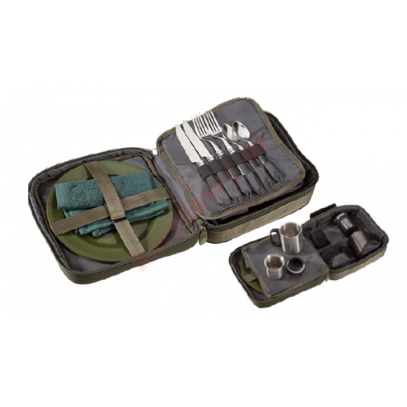 Zestaw wysokiej jakości przyborów obiadowych pod namiot. Składa się z ręcznika kuchennego, trwałych plastikowych talerzy, kubków ze stali nierdzewnej, dwóch kompletów sztućców, oraz uszczelnionych pojemników na sól i pieprz ze stali nierdzewnej. Wszystkie te przedmioty znajdują się w wysokiej jakości wodoodpornym pokrowcu z zamkiem błyskawicznym i uchwytem do przenoszenia.