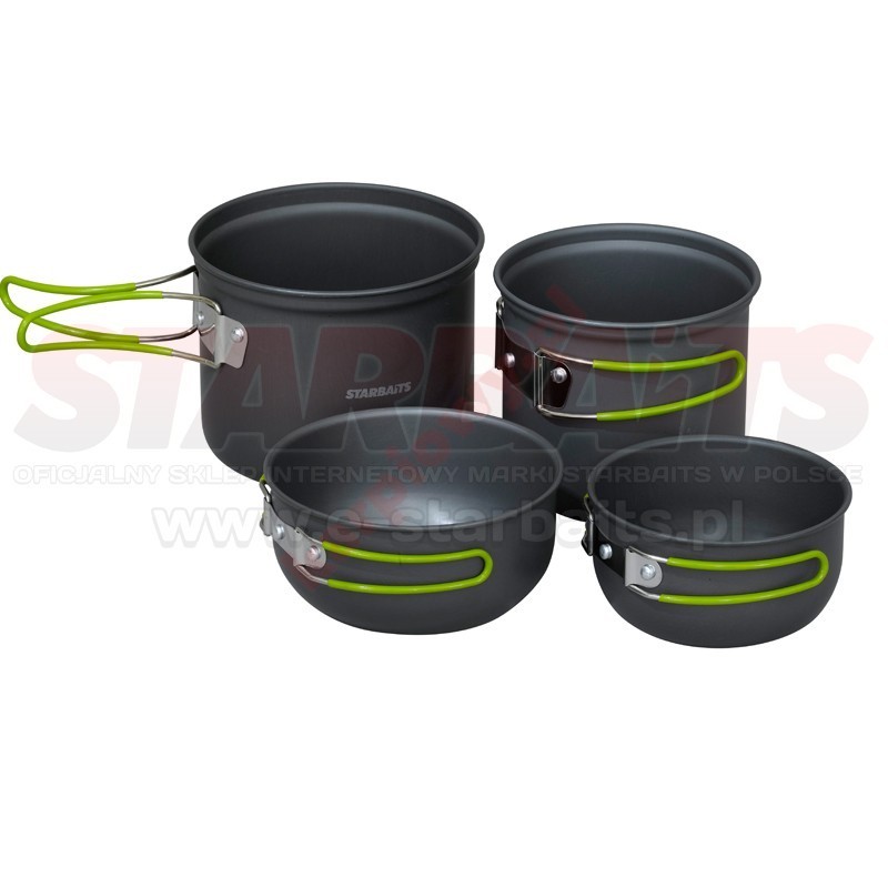 Ten łatwy do przechowywania zestaw anodowanych rondli oferuje wiele wariantów gotowania. Są w nim 2 rondle, 2 małe patelnie i pokrywki. Każde naczynie ma składaną rączkę, która zapewnia stabilność podczas gotowania. Do zestawu dołączona torba z siatki dla ułatwienia transportu.