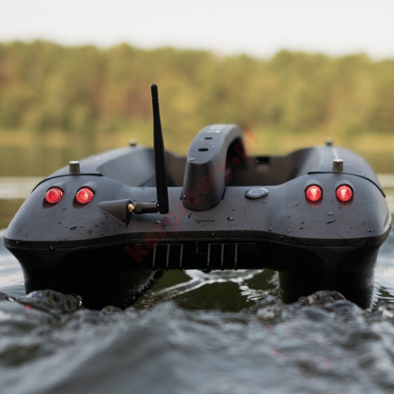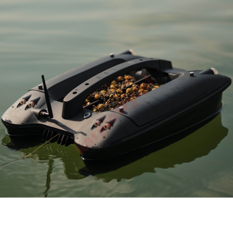 Łódka zanętowa jest czarna i wyposażona w 2 światła przednie i 4 tylne, dzięki czemu z łatwością ją wypatrzysz nawet przy niskiej