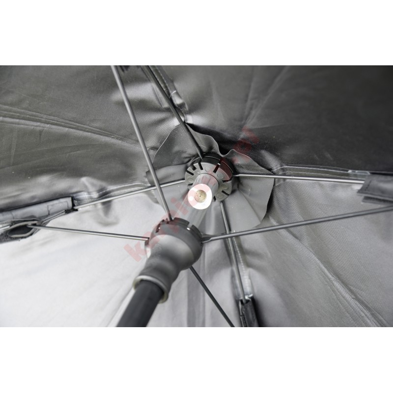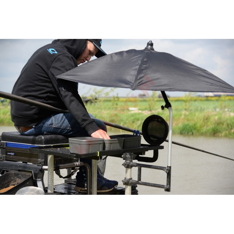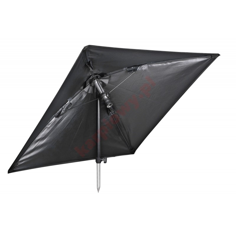 Parasol o wymiarach 80x80 cm zapewnia ochronę przed słońcem i deszczem podczas jedzenia i przynęty. Drążek można przymocować do parasola zarówno prosto, jak i pod kątem. Dodatkowy dostarczony drążek jest wygięty, dzięki czemu można uzyskać jeszcze więcej pozycji, bez przeszkadzania drążka. W zestawie ze wzmocnionym etui i paskiem na rzep dla kompaktowego transportu.