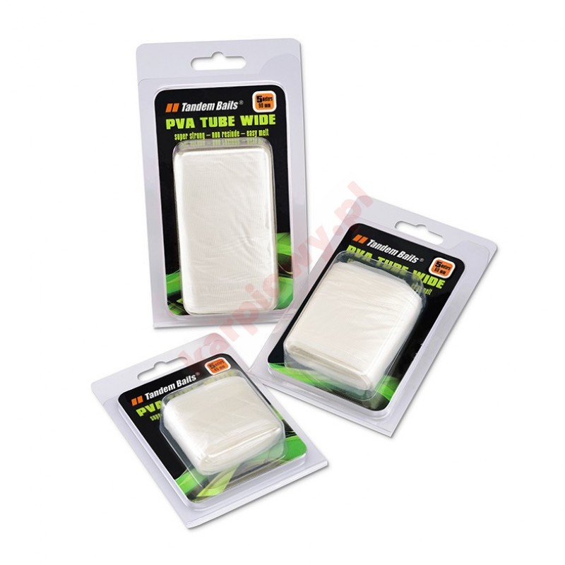 Materiał rozpuszczalny uniwersalnego zastosowania. Długa tuba PVA w jednym kawałku z której można kreować worki dowolnej długości, zgrzewając na domowej zgrzewarce lub łącząc za pomocą wody. Posiadają zaletę której nie mają inne materiały PVA, można zrobić długą tubę, napełnioną zanętą i płynnymi atraktorami, i bardzo precyzyjnie podać z łodzi na dużych odległościach lub blisko brzegu w paśmie roślinności. Rękaw PVA w odcinku 5 m / 90 mm.