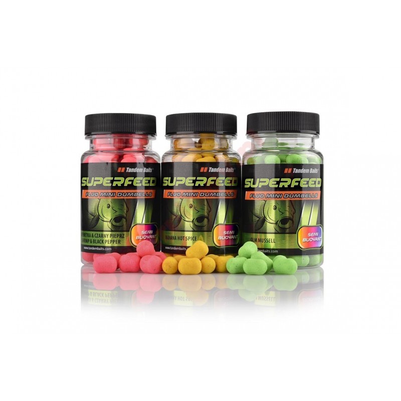 SuperFeed Fluo Semi Buoyant Mini Dumbells posiadają ekstremalnie widoczny kolor,tworzą wizualny sygnał przyciągający ryby. Wykonane z perfekcyjnie dobranej mieszanki najlepszych jakościowo składników: atraktorów, ekstraktów i aromatów. To neutralnie wybalansowane dumbellsy, które niwelują wagę haczyka. Zestaw z taką przynętą zachowuje się w wodzie absolutnie naturalnie i nie płoszy ryb. To niezastąpiona przynęta w łowiskach o dużej presji wędkarskiej. Doskonale sprawdzi się w zbiornikach porośnietych podwodną roslinnością oraz z grubą warstwą mułu.