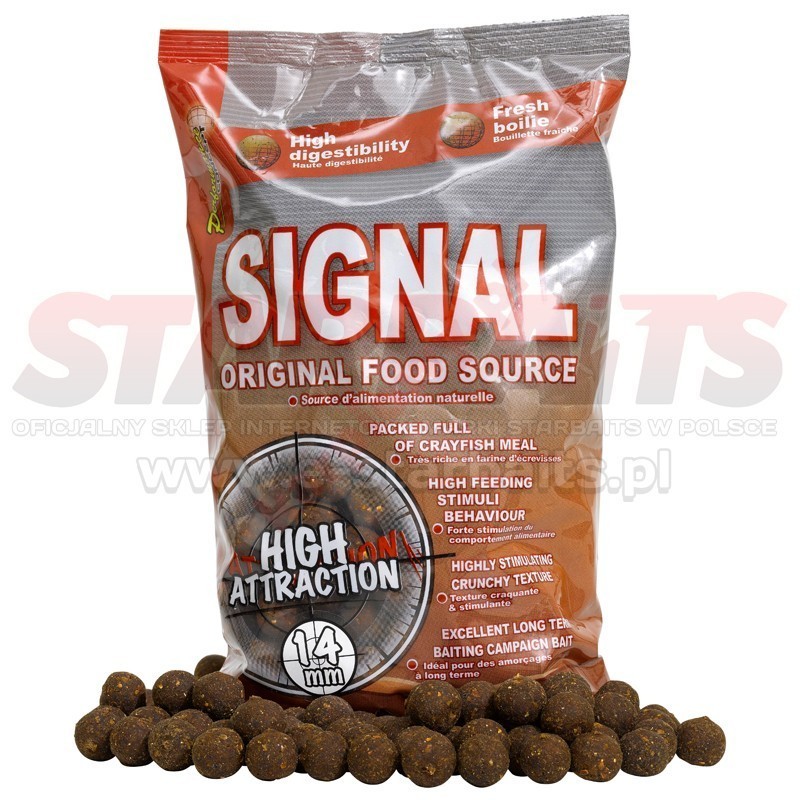 Naturalne przynęty z serii Performance Concept. Podstawowymi komponentami kulek Signal są cząsteczki raka, czerwonych robaków i kiełża. W celu optymalizacji chrupkości do produkcji użyto dużych cząstek muszli ostryg i skorupek jajek. Skład dopełnia bogactwo protein, soli mineralnych, białek rozpuszczalnych w wodzie oraz ostrych przypraw. Zostały stworzone bez użycia sztucznych barwników, ich ostateczny kolor wynika z procesu produkcji. Te wszystkie starannie dobrane składniki powodują, że karpie, występujące w łowisku, nie są w stanie powstrzymać się od pobierania leżących na dnie przynęt Signal. Ubiegłoroczne testy oraz początek tegorocznego sezonu wykazały wysoki poziom skuteczności smaku Signal, który sprawdził się zarówno we wczesnowiosennych zimnych wodach, jak i wodach cieplejszych. W wielu przypadkach skuteczność przynęt Signal zwiększa użycie Dipu Attractor Signal. Intensywny zapach potrafi z dużych odległości ściągnąć karpie w nasze łowisko. Ten mocny, niezbyt przyjemny dla nas, aromat może spowodować, że po otwarciu Dipu Attractor Signal w mieszkaniu nie spotkamy się z zadowoleniem pozostałych domowników. Używajmy go więc tylko na łowisku w celu zwiększenia skuteczności i częstotliwości brań. Jak każdy nowy smak, Signal wymaga cierpliwego testowania w określonych warunkach, w celu uzyskania w pełni zadowalającego efektu końcowego. Zdecydowanie ułatwi nam to dobranie właściwej średnicy i rodzaju przynęty dla danego łowiska.
