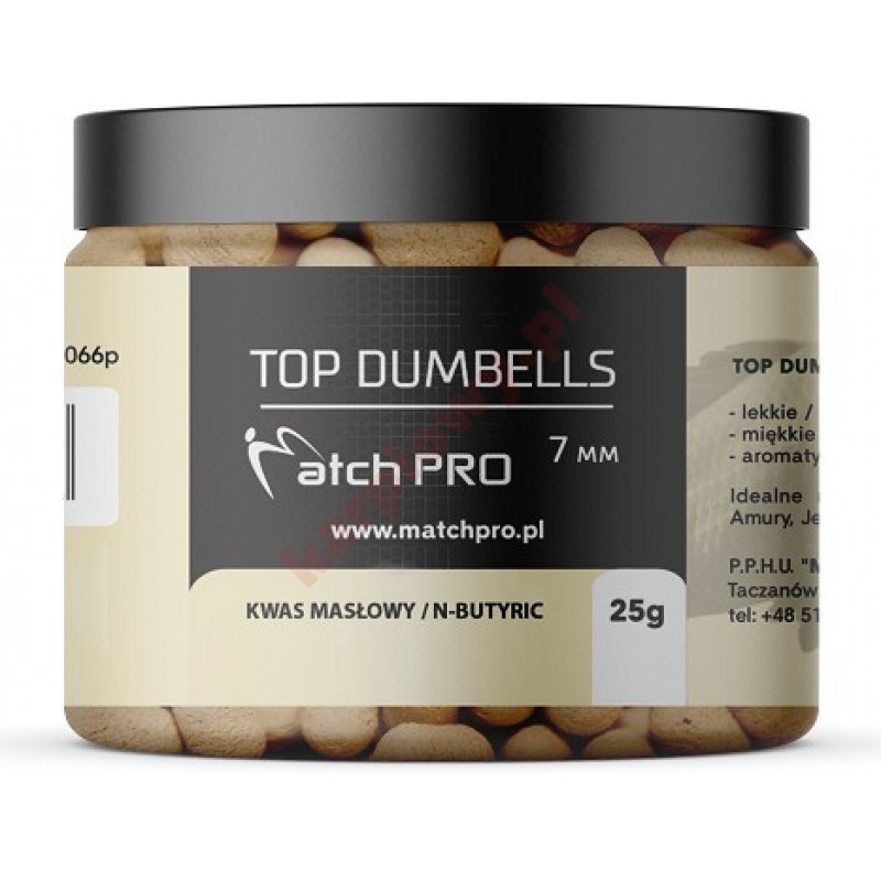 Seria najwyższej jakości przynęt o kształcie wałka (dumbells) w rozmiarze 7mm. Długie i intensywne testy tych przynęt pozwoliły dopracować ich skład i właściwości tak aby były bardzo skuteczne w każdych warunkach. To co wyróżnia Matchpro top dumbells to idealna miękkość, dzięki której ryby pewnie ją pobierają. Wyjątkowa lekkość przynęty zapewnia bardzo naturalne zachowanie się w wodzie co niezwykle podnosi skuteczność łowienia. Top Matchpro Dumbells są bardzo aromatyczne, oddając przez długi czas równomiernie aromat w wodzie co przekłada się na dużą ilość brań. Różnorodność smaków i kolorów pozwala dopasować się każdemu wędkarzowi do aktualnych warunków panujących na łowisku.