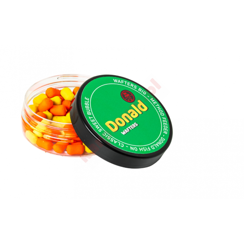 Waftersy posiadają dwa najskuteczniejsze kolory czyli “żywa” pomarańcz i jaskrawa żółć, a do tego słodki zapach przypominający gumę balonową Donald stawiają Donalda wysoko na liście pozycji koniecznych w posiadaniu wędkarza methodowego. Przynęta skuteczna praktycznie o każdej porze roku. Najlepszą prezentację otrzymamy montując waftersy na igle lub bagnecie.