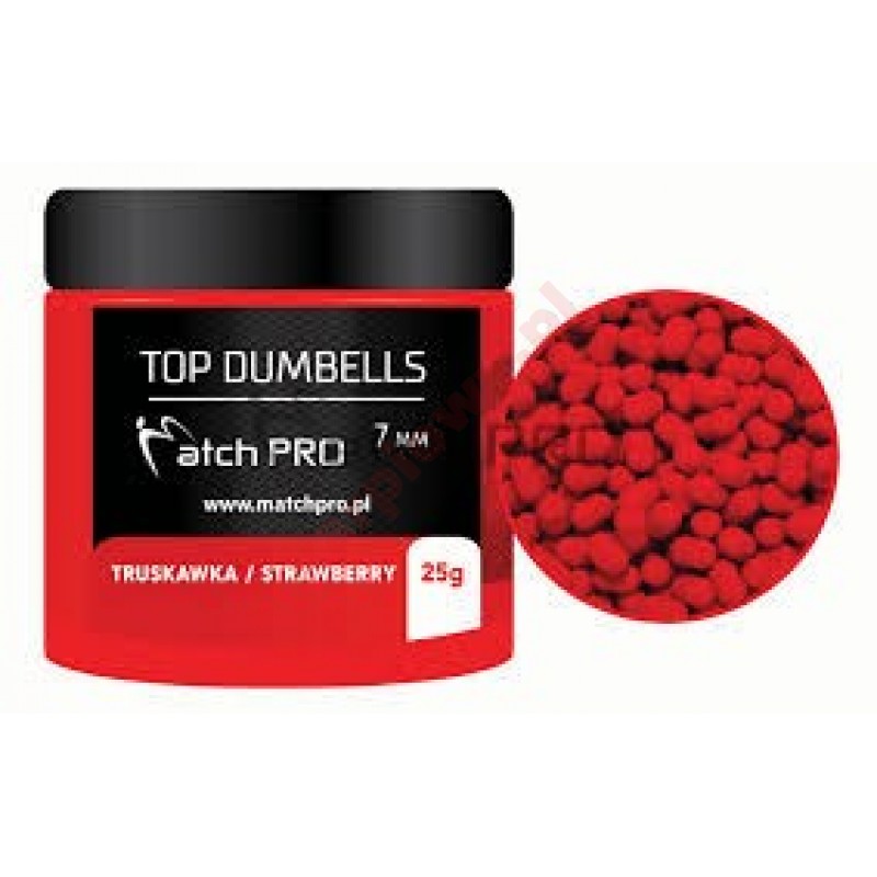 Seria najwyższej jakości przynęt o kształcie wałka (dumbells) w rozmiarze 7mm. Długie i intensywne testy tych przynęt pozwoliły dopracować ich skład i właściwości tak aby były bardzo skuteczne w każdych warunkach. To co wyróżnia Matchpro Top Dumbells to idealna miękkość, dzięki której ryby pewnie ją pobierają. Wyjątkowa lekkość przynęty zapewnia bardzo naturalne zachowanie się w wodzie co niezwykle podnosi skuteczność łowienia. Top Matchpro Dumbells są bardzo aromatyczne, oddając przez długi czas równomiernie aromat w wodzie co przekłada się na dużą ilość brań. Różnorodność smaków i kolorów pozwala dopasować się każdemu wędkarzowi do aktualnych warunków panujących na łowisku.