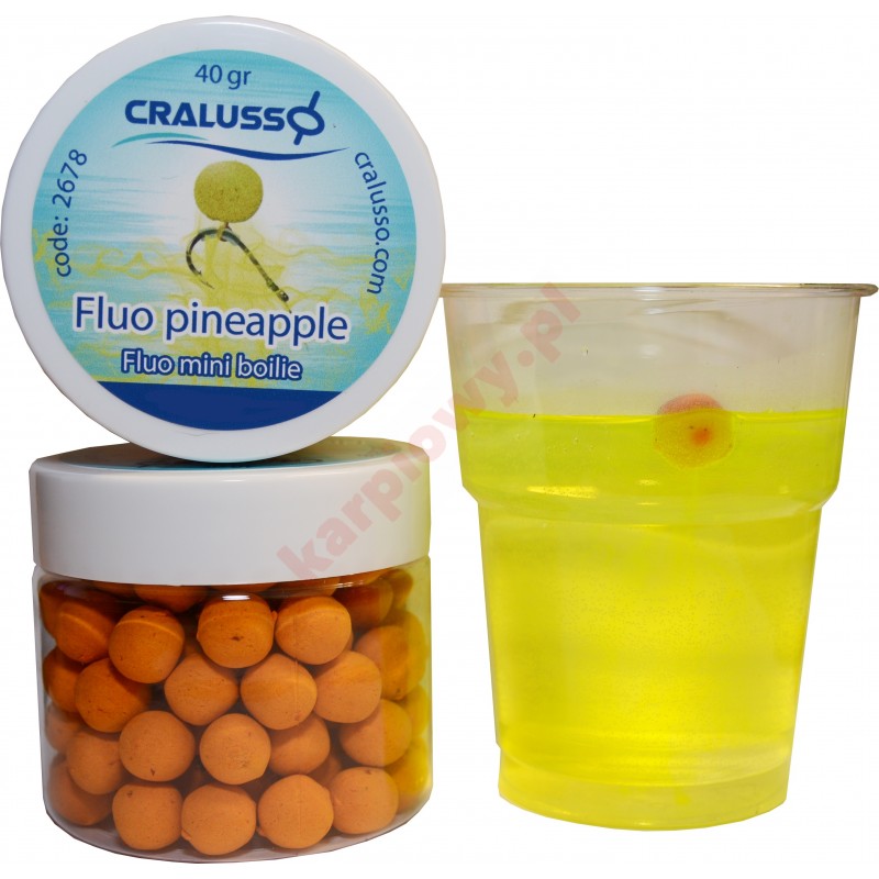 Kuleczki typu pop-up o zapachu ananasa. Ich szczególną zaletą jest to, że po wrzuceniu do wody wytwarzają bardzo atrakcyjną dla ryb chmurę w kolorze fluo.