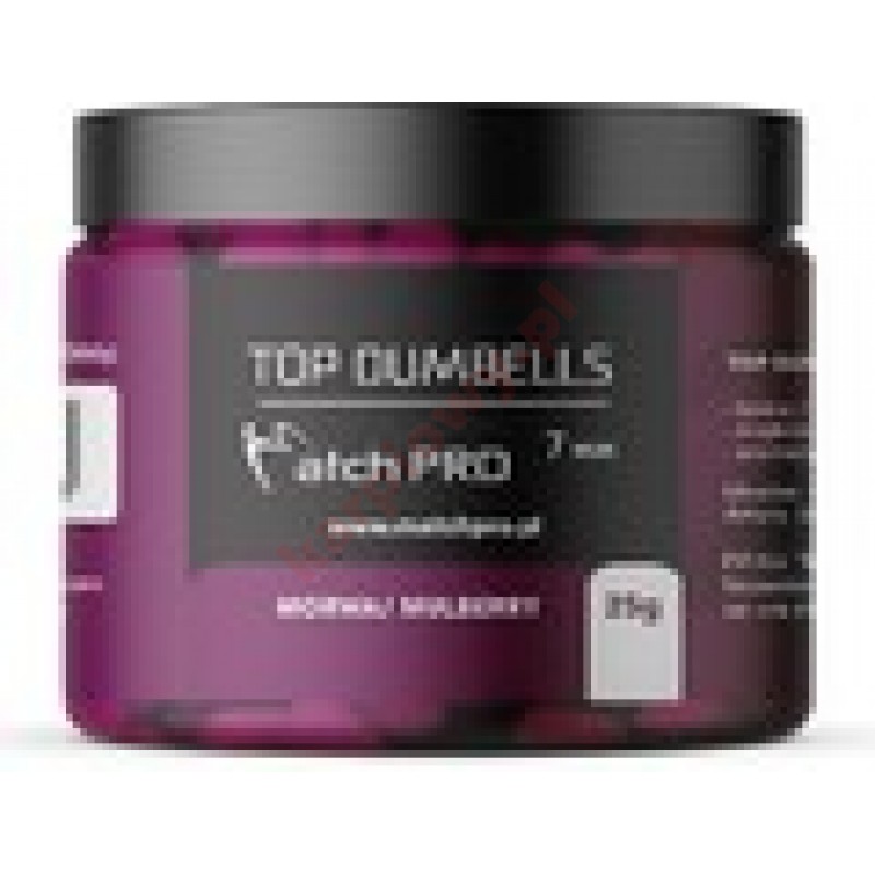Seria najwyższej jakości przynęt o kształcie wałka (dumbells) w rozmiarze 7mm. Długie i intensywne testy tych przynęt pozwoliły dopracować ich skład i właściwości tak aby były bardzo skuteczne w każdych warunkach. To co wyróżnia Matchpro Top Dumbells to idealna miękkość, dzięki której ryby pewnie ją pobierają. Wyjątkowa lekkość przynęty zapewnia bardzo naturalne zachowanie się w wodzie co niezwykle podnosi skuteczność łowienia. Top Matchpro Dumbells są bardzo aromatyczne, oddając przez długi czas równomiernie aromat w wodzie co przekłada się na dużą ilość brań. Różnorodność smaków i kolorów pozwala dopasować się każdemu wędkarzowi do aktualnych warunków panujących na łowisku.