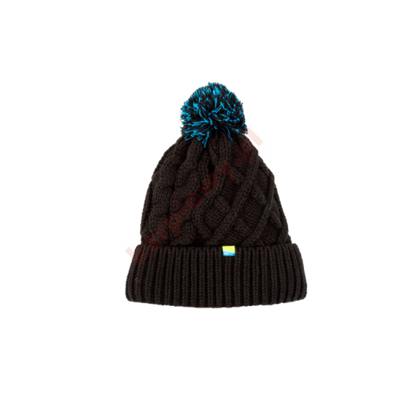 Czapka z pomponem z dzianiny kablowej w kolorze czarnym z akcentem w kolorze niebiesko-czarnym. Posiada ciepłą podszewkę z polaru, dzięki czemu idealnie nadaje się na najzimniejsze dni zimy.