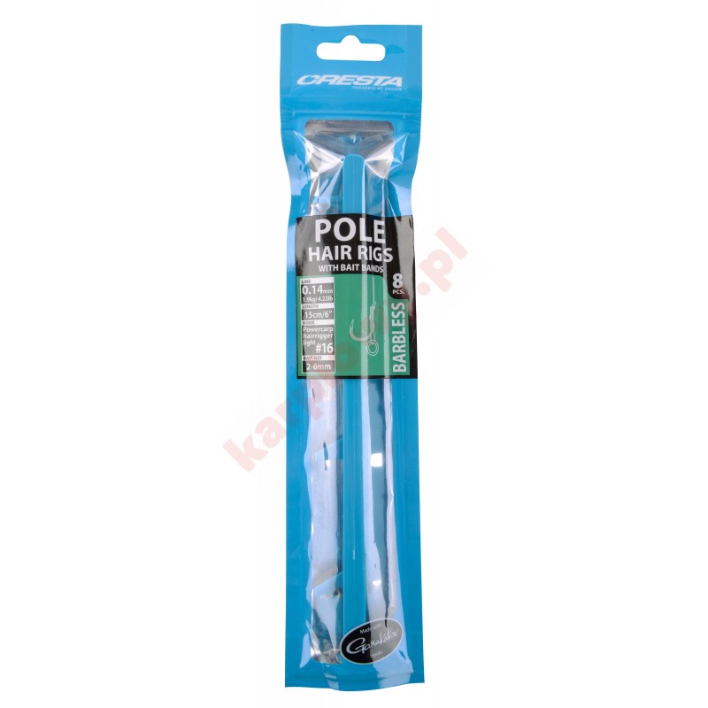 Te przypony do włosów Cresta są wykonane z wysokiej jakości komponentów i wyposażone w oryginalny haczyk Gamakatsu POWERCARP HAIR RIGGER LIGHT. Dobrze wyważone średnice żyłek i rozmiary haczyków w połączeniu z 15 cm długości i zamontowaną opaską na przynętę sprawiają, że te długości haczyków nadają się do łowienia z tyczką w celach komercyjnych. Każde opakowanie jest dostarczane w komplecie z jednostką CRESTA Store Unit, która zapewnia, że 8 długości haczyków pozostaje prosto i wygodnie przechowywanych i można je umieścić bezpośrednio w MODUŁOWYM PRZYPONIE CRESTA.
