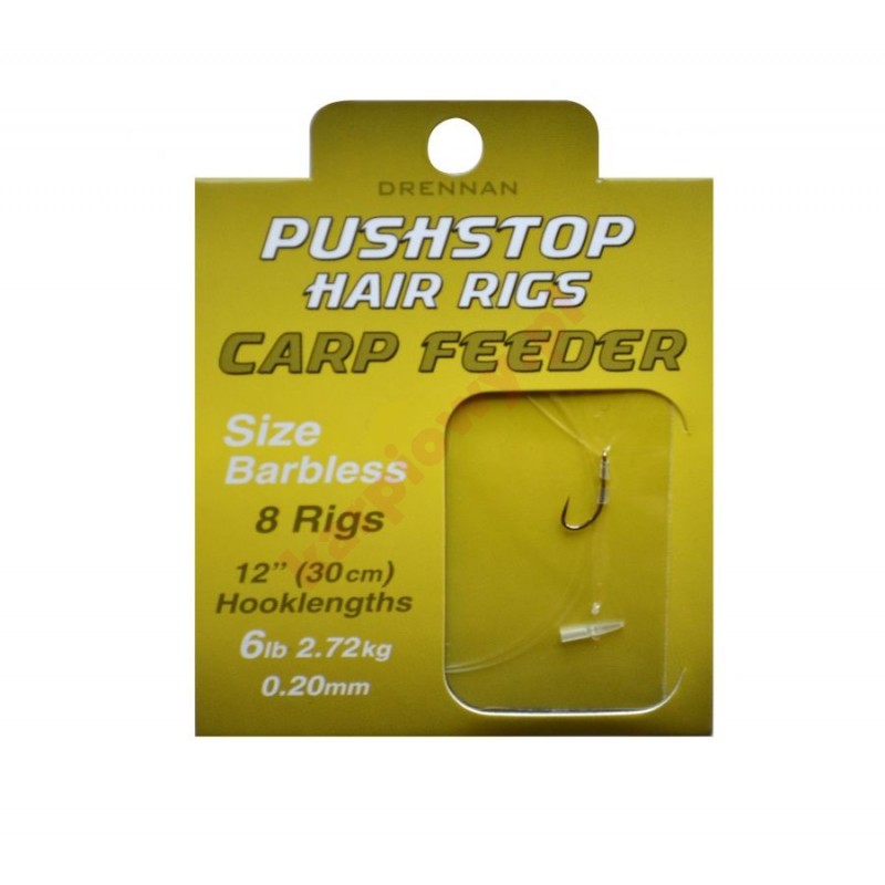 Zestaw gotowych przyponów przeznaczonych do łowienia na metodę gruntową. Haczyki nie posiadają zadziorów. Długość przyponu 30cm. Opakowanie zawiera 8szt. gotowych przyponów. Przypony wyposażone są we włos, a na nim zamontowany jest stoper 'pushstop'. Niezbędnymi narzędziami do montażu na tym przyponie pelletu lub kulki jest wiertełko oraz igła 'pushstop'. Obydwa przedmioty są do nabycia w naszej ofercie.